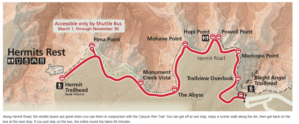 We wanted to see the maximum amount of the South Rim with minimum movement. Luckily there is a shuttle system that makes this pretty easy. There is a shuttle bus that takes you to Hermit’s Rest right by the Bright Angel Lodge, and it has several stops along the way. Perfect for tired legs and limited time.