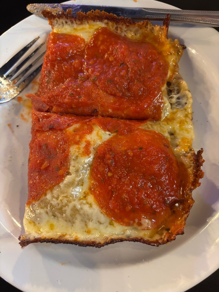 We always get their Cheese Bread Sticks to start, they are SOOO GOOOOD! We bounce between a few of our favorites. On this trip Chris got the Buffalo chicken pizza, and I got the Detroit-style pepperoni. Detroit-style by default comes with the spicy pepperoni “cups” but I always ask for normal pepperoni instead.