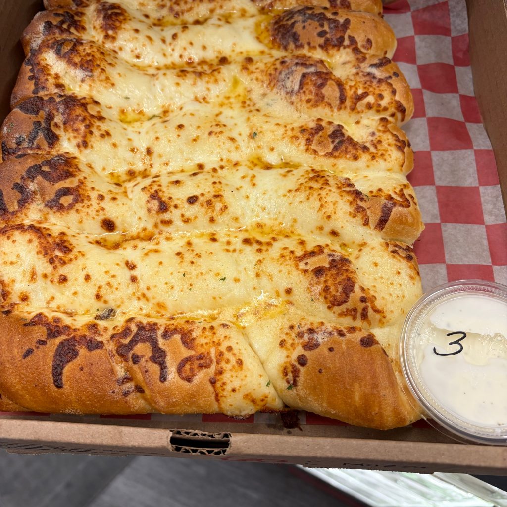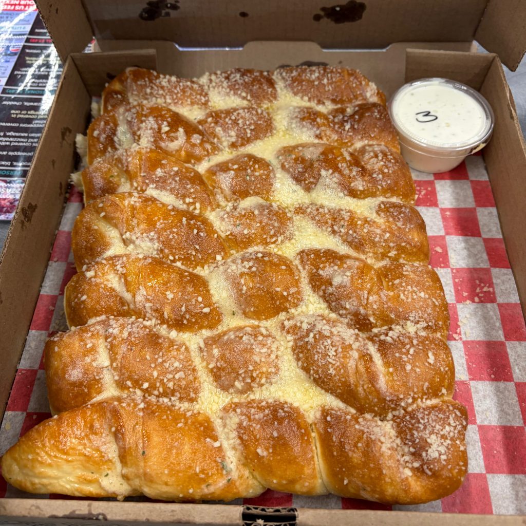 We get cheese bread if it’s available whenever wherever. It is rare for us to select regular breadsticks if cheese can possibly be involved. Pizza Man is a rare situation where Chris prefers the regular Garlic Bread Twists. I think he’s crazy and I prefer the Mozza Bread Twists. The Garlic Bread Twists that Chris loves are definitely delicious, don’t get me wrong. Especially dipped in their ranch. I guess it’s better this way, because he orders the Garlic bread twists for himself, and I get my very own batch of Mozza bread twists. Though now we share with our kiddos, we’re a divided family. Chris shares the Garlic Bread Twists with Mae, and I share the Mozza Bread Twists with Trey.