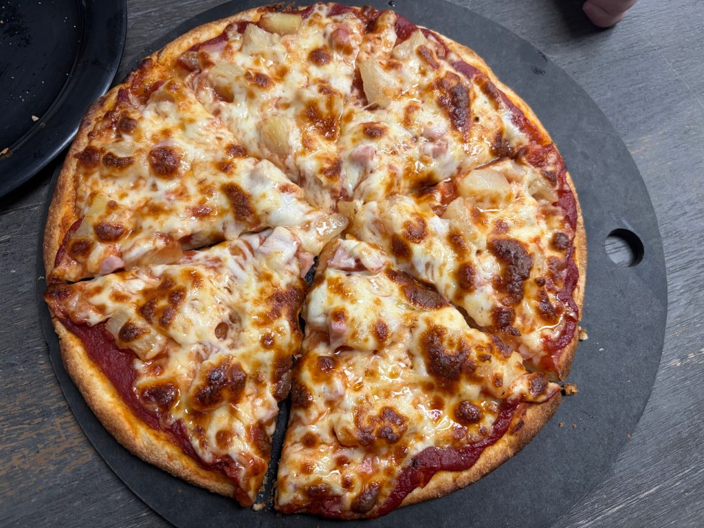 We got one half cheese/half pepperoni pizza with mild sauce and one ham and pineapple pizza with medium sauce. The sauce was way better than what you’d get at Ogden Pizzeria. I couldn’t really taste the difference in the sauce, and the medium wasn’t too spicy, even for our 6-year-old. Chris liked the medium sauce more- he said it was a different flavor, not necessarily hotter.