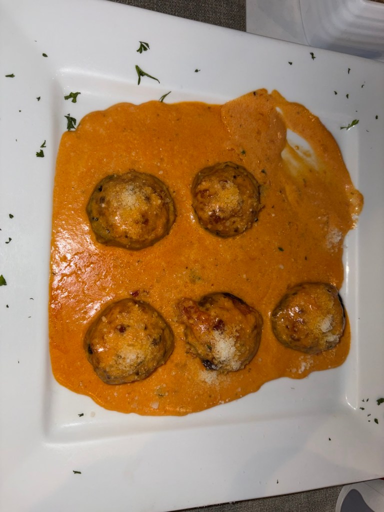 They start you off with some complimentary bread, which is warm and fantastic on its own, but we also got stuffed mushrooms as an appetizer and dipped the bread in the brandy cream sauce that came with the stuffed mushrooms, and it just elevated the bread even more. The brandy sauce is a mix of Alfredo and marinara.
