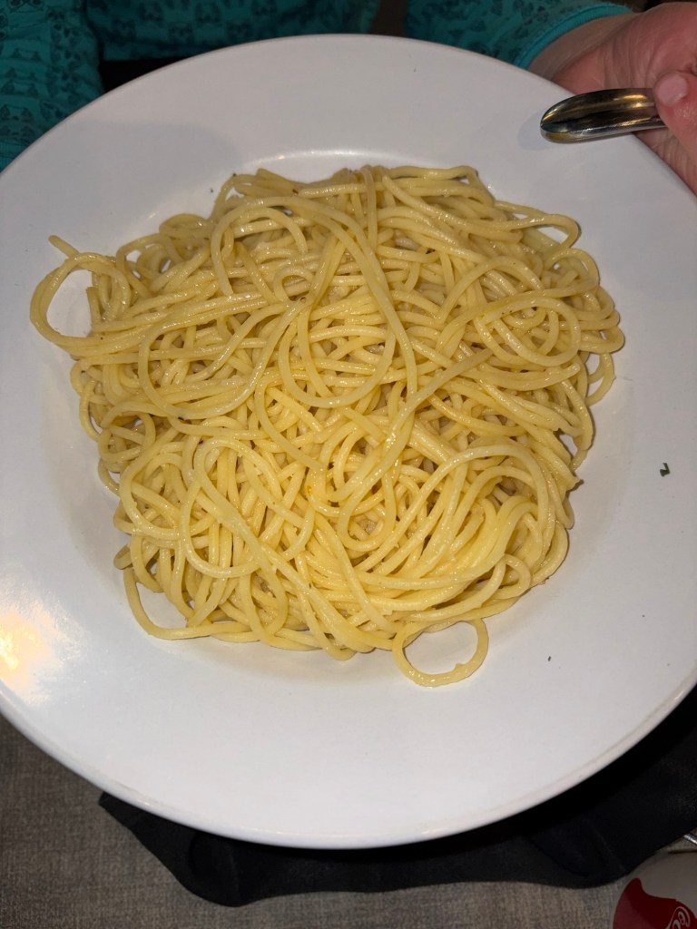 My 6-year-old daughter got buttered noodles, and here’s where the pizza rating comes in. Our 4-year-old son got the kids cheese pizza. This pizza does not come on the adult menu. When it came out, it looked so good that we took one slice, split it in half, and we each had a taste. It was so good we wanted more! The sauce is delicious, and the dough was fluffy and had a good crunch.