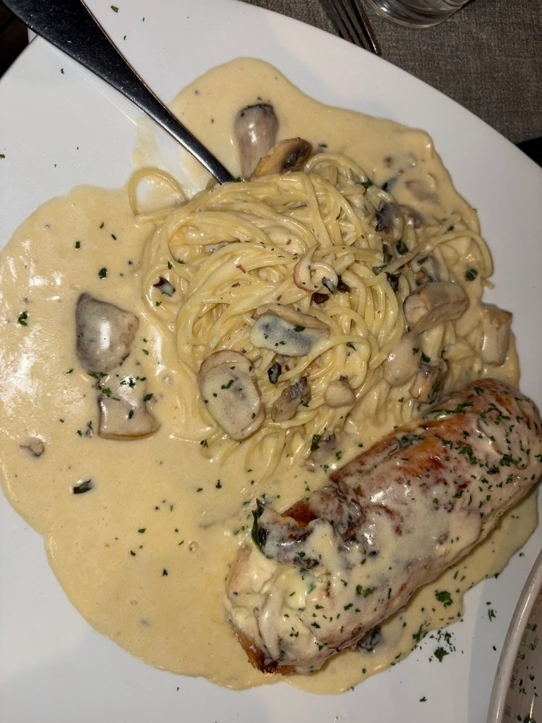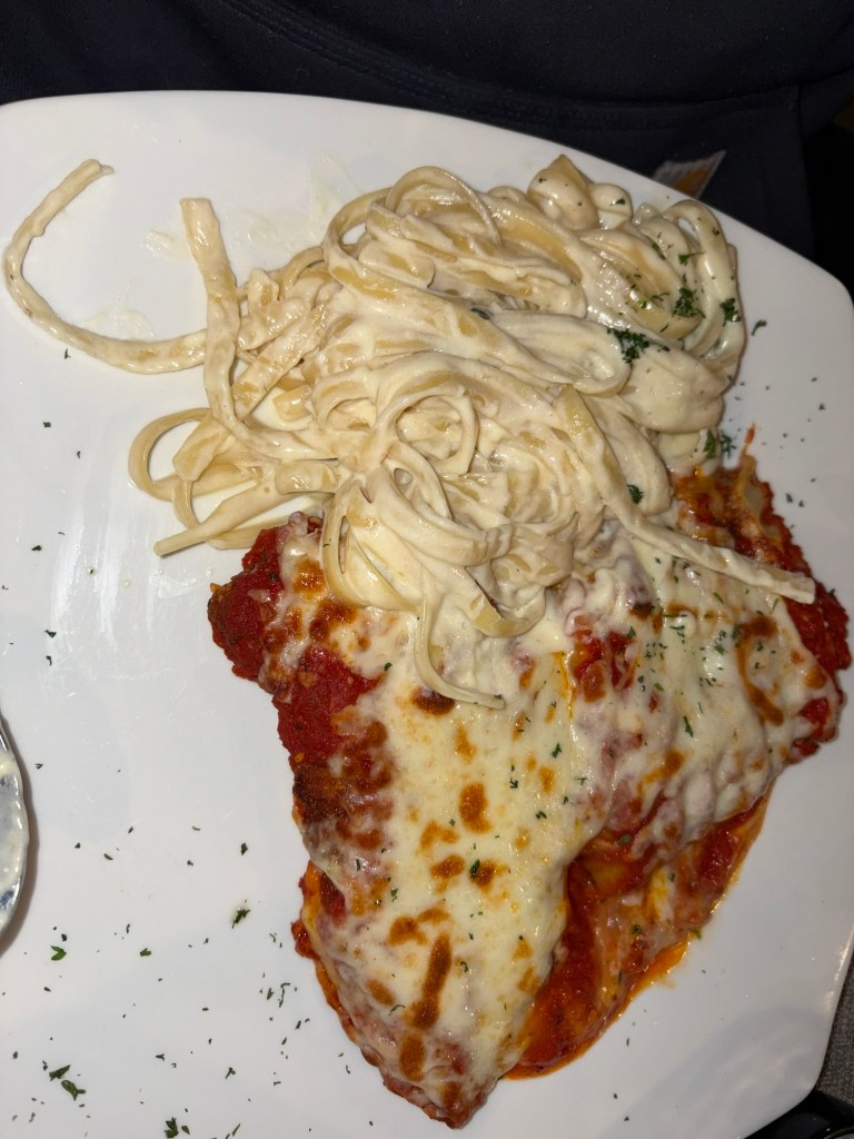 Chris got the Tour of Italy, which came with lasagna, chicken parm, and fettuccine Alfredo. He really enjoyed the marinara over the lasagna and chicken parm, it’s his first restaurant experience where he preferred the marinara to the Alfredo.