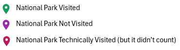 - Great Basin National Park (marked as red because I visited with my grandparents as a kid, and I don’t really remember it)