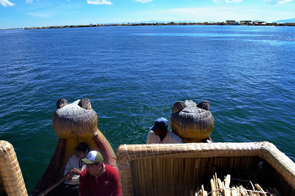 The boat we arrived on left without us and we awaited the arrival of the romantic boat. This unique vessel was made from two of the original reed boats they used to live on centuries ago, combined into a catamaran. The boats are shaped like pumas (an important Incan symbol). The boat even had a cabin, though we chose to ride on top. The islanders cleverly use plastic bottles left behind by tourists as extra flotation, repurposing trash into something useful.