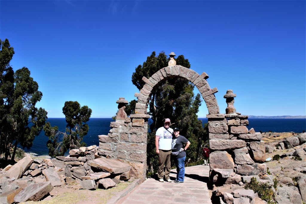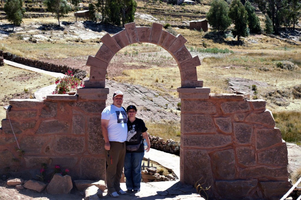 Cleaning and dying llama wool demonstration After the wool demonstration, three men and one woman danced and played pipes.Me enjoying the dancing and beautiful viewMe and Chris with one of the natives. He made the belt he is wearing. When they get married, the women cut their hair and give it to their betrothed to weave into their belt.Just outside the restaurant stood an archway which perfectly framed the landscape.
