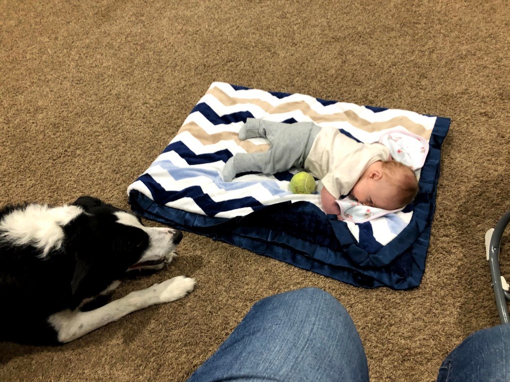 Stanley with our tiny Baby Mae, trying to get her to play catch!
